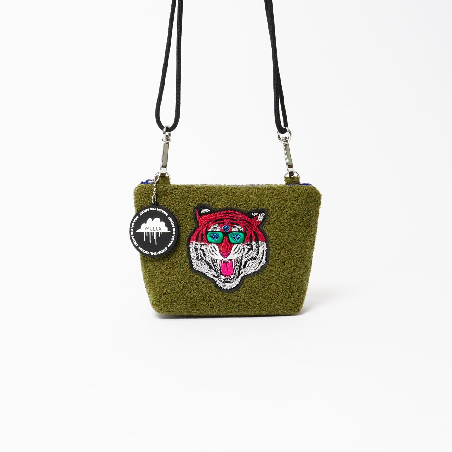 手触りの良いもこもこ生地に、刺繍のワッペンが目を惹くポシェットです。